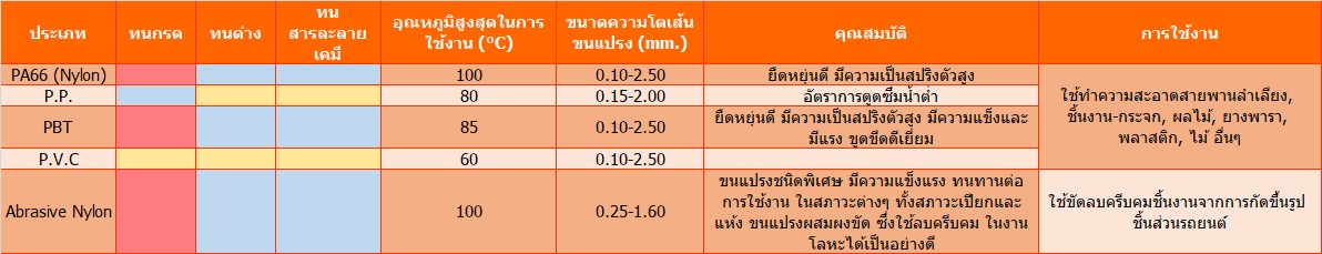 การเลือกใช้ควรเลือกให้เหมาะสมกับชิ้นงานที่ต้องการ brushing, เช่น เหล็กหล่อเหมาะกับแปรงซิลิกอนด์คาร์ไบด์(SC)เป็นอย่างมาก และ อลูมิเนียม ไททาเนี่ยม หรือ สเตนเลสสตีล จะเหมาะสมมากกับการใช้แปรงที่ใช้ขนอลูมิเนี่ยมอ๊อกไซด์(AO). AO เหมาะสมมากกับชิ้นงานที่มีความแข็งของผิวไม่มากเช่น silver, gold, pewter, Aluminum, Copper.