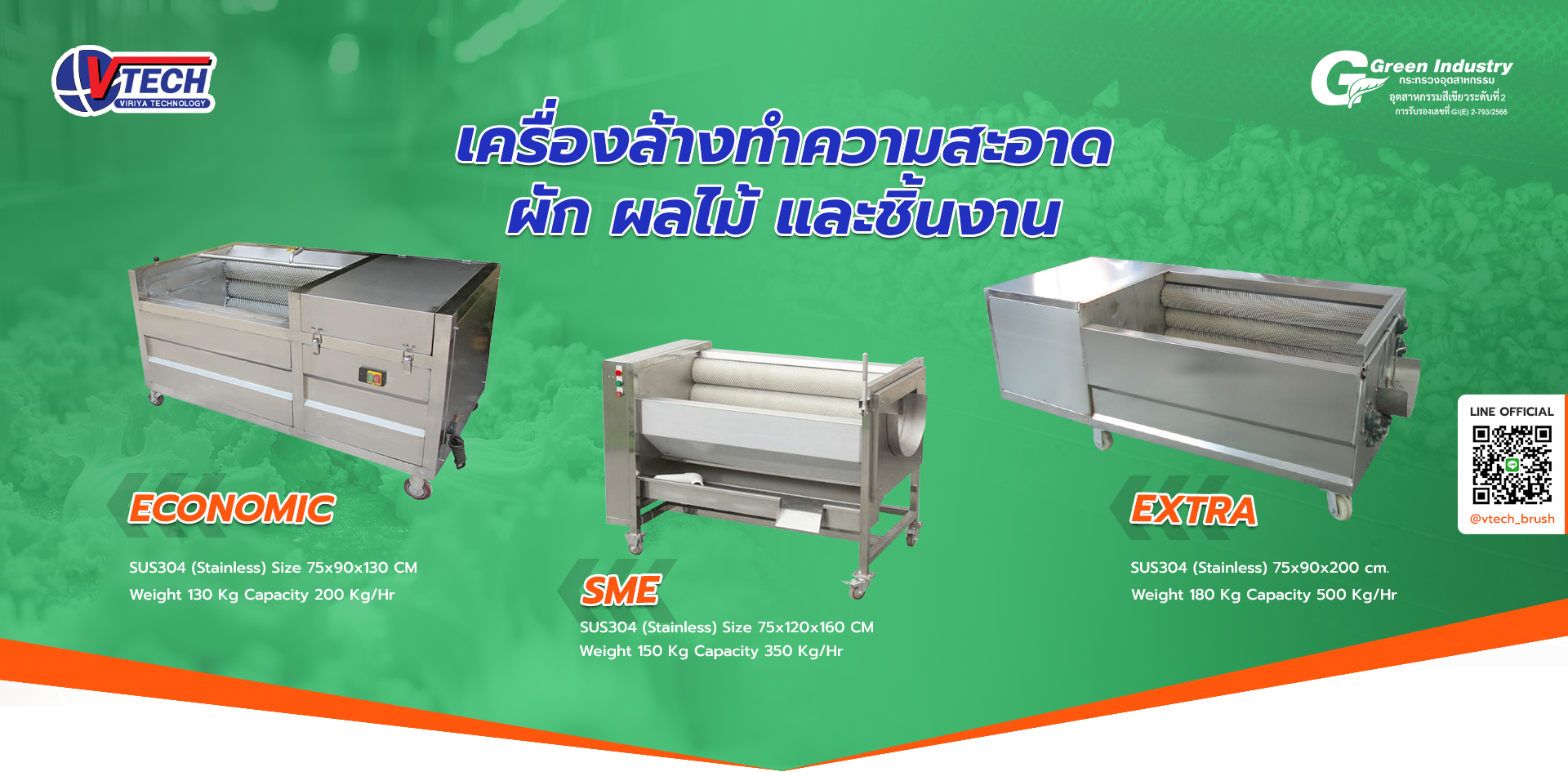 เครื่องขัดล้างทำความสะอาด เป็นอุปกรณ์อเนกประสงค์และมีประสิทธิภาพที่สามารถจัดการผักและผลไม้ได้ทุกประเภทและทุกขนาด ได้รับการออกแบบให้เป็นไปตามมาตรฐานด้านความสะอาดและสุขอนามัย ด้วยกำลังของมอเตอร์ขนาดใหญ่ส่งผ่านไปยังลูกกลิ้งขนแปรงที่ทรงพลังสามารถขัดล้างหรือลอกเปลือกผิวผลไม้ได้โดยไม่เปลืองแรงคน เครื่องล้างนี้จะมีแปรงลูกกลิ้งและน้ำช่วยกันทำงานเพื่อขจัดหรือล้างคราบดิน คราบผง และสิ่งแปลกปลอมต่างๆออกไปจากผลิตภัณฑ์ โดยตัวเครื่องจักรมีระบบไฟให้ลูกค้าเลือก 2 แบบคือ แบบระบบไฟบ้านและโรงงาน