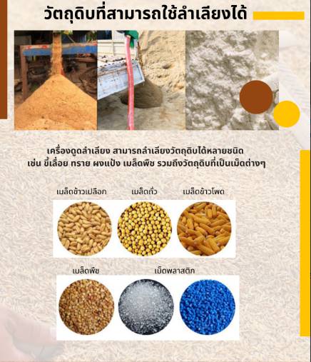 ใช้เพื่อดูดลำเลียงวัตถุดิบทางไกล เช่น เศษปูน เศษดิน เมล็ดข้าวธัญพืช และ เศษหินหรือกรวด เพื่อลดภาระการใช้แรงงานคน และไม่ศูนย์เสียทรัพยากรโดยสิ้นเปลือง ช่วยประหยัดเวลา และลดต้นทุนวัตถุดิบได้เป็นอย่างดี ขับเคลื่อนด้วยมอเตอร์ Mitsubishi ขนาด 3 แรงม้า อัตราการขนถ่าย 3-5ตัน/ชั่วโมง